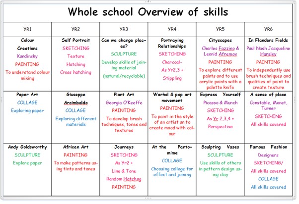 Through an engaging and exciting Art curriculum, all children will make progress and develop their creative skills and artistic knowledge. At the end of each unit, teachers will assess learning through specific tasks. By the end of their primary education, pupils will be have learnt the following skills: